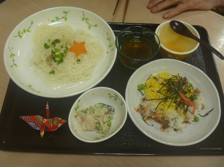 昼食のメニューは七夕そうめん、チラシ寿司、小鉢&みんなで作った七夕ゼリーです。